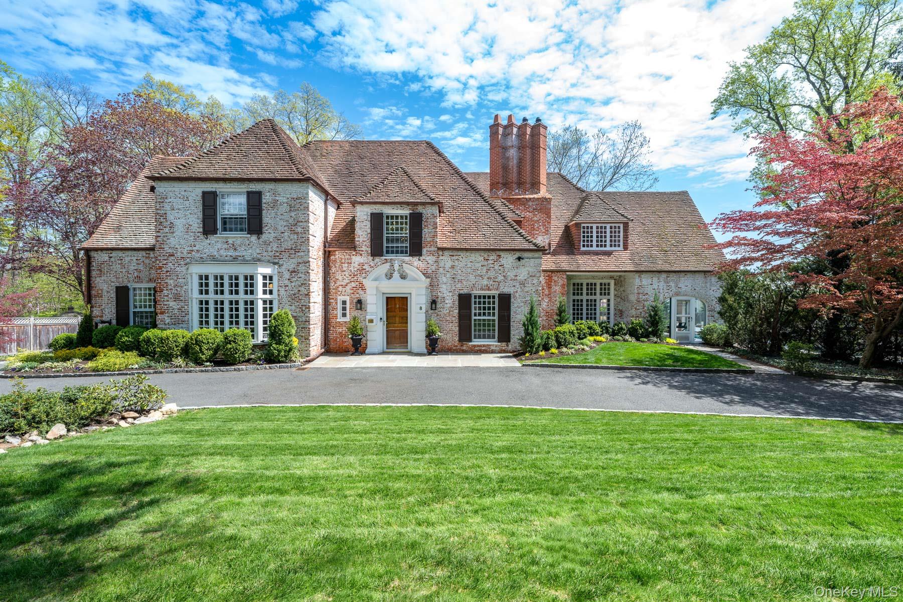 Situated on over half an acre of lushly landscaped property, 8 Rittenhouse is a remarkable whitewashed brick French Country manor featuring a sculpted brick chimney, varied rooflines, and pristine exterior stonework, designed by the venerated architect Lewis Bowman. A semi-circular driveway welcomes you, and upon entering the home, you are immediately struck by the light and openness created by the two-story entrance hall. A sunken living room features an impressive fireplace with a carved mantel, a built-in bar, and elegant elliptical windows—offering a truly captivating space. The living room flows into an inviting sunroom that overlooks the grotto-style black-bottom pool, jacuzzi, and waterfall, creating a natural amphitheater-like setting that is truly one of a kind. The home offers an oversized kitchen with top-of-the-line appliances, adjoined by a breakfast area and a formal dining room. The first floor is completed by a charming library or office and a powder room. The second level features a primary suite with a newly renovated spa-like bathroom, complete with a soaking tub, double vanity, and radiant heated floors. There are three additional family bedrooms, two full bathrooms, and guest quarters accessed from both the kitchen and the second floor. The lower level offers a versatile space for hobbies, a gym, and play, along with a laundry area and ample storage. Beyond the enchanting pool is a flat, usable yard ideal for play, as well as an entertaining terrace that connects the kitchen to the pool area for seamless indoor-outdoor living. A terra-cotta roof, full-house generator, two-car garage, new copper gutters, and more complete this exceptional offering.